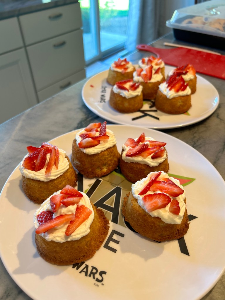 Just a few weeks ago we got a new mini shortcake pan. And I decided we just HAD to make mini strawberry shortcakes. We filled each little cake spot up to what seemed like a normal level. Oh boy we were wrong! The cakes all rose and grew into one giant cake across the top. Then they stuck to the pan.